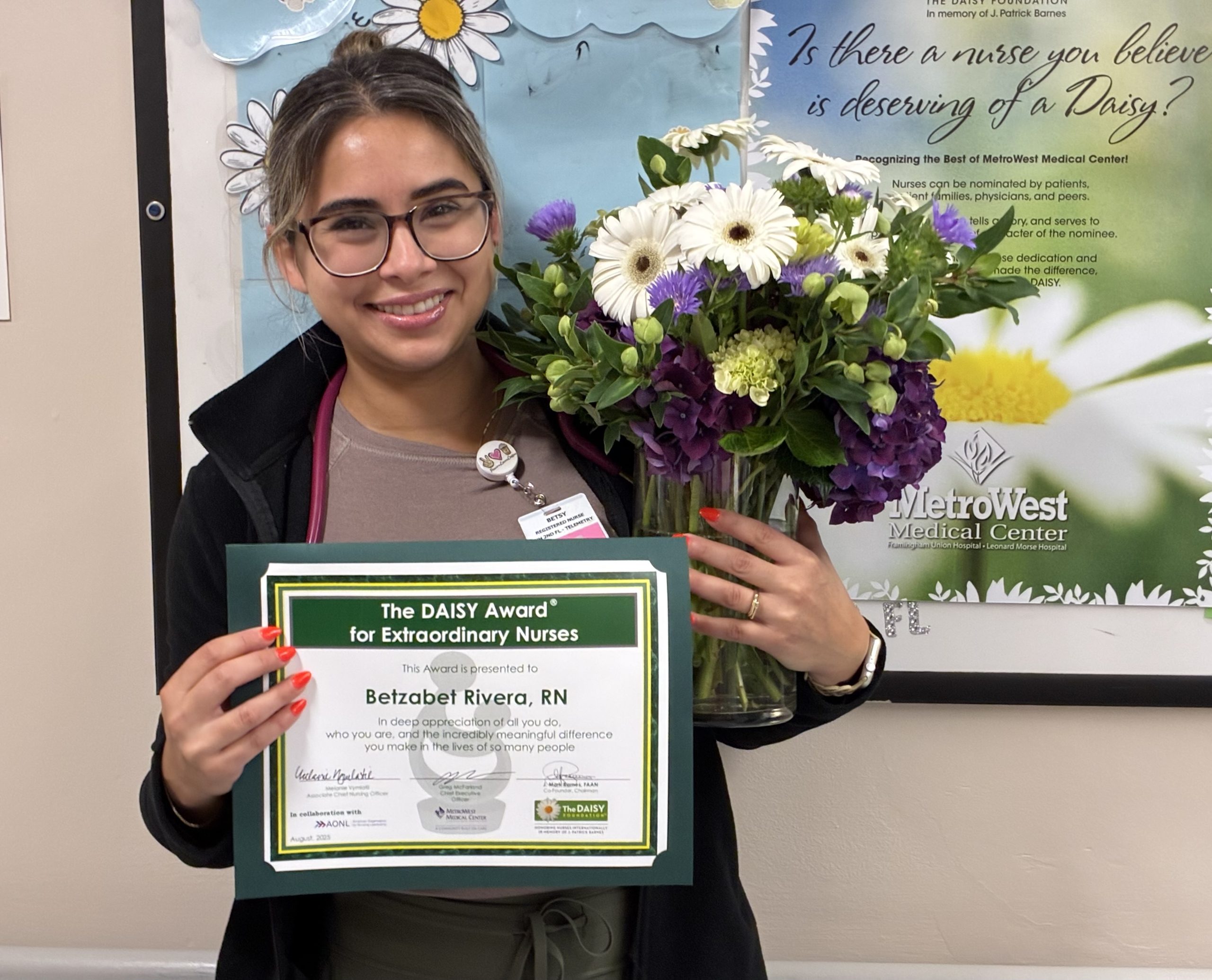 Metrowest Medical Center names Betzabet Rivera ADN, RN as the most recent recipient of the DAISY Award. Betsy is a Telemetry Nurse who has worked at Framingham Union Hospital for three years. The DAISY Award is a prestigious recognition given to nurses who go above and beyond in providing extraordinary, compassionate care to patients and their families.