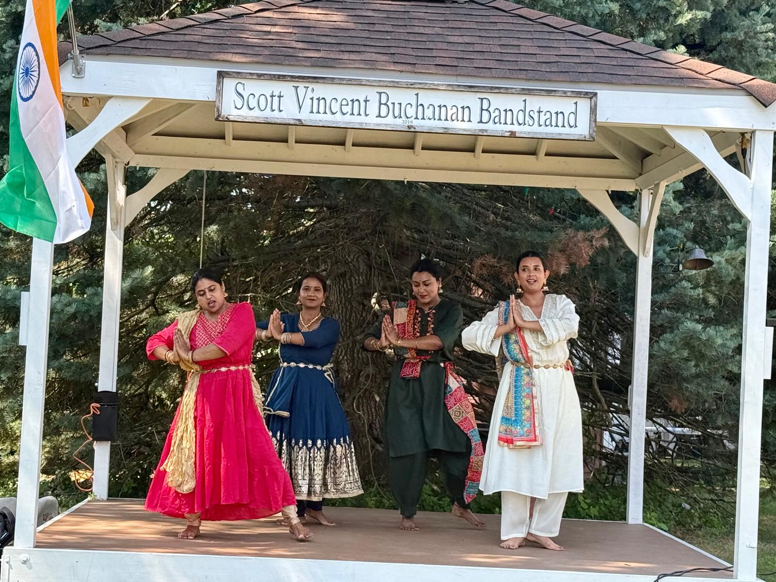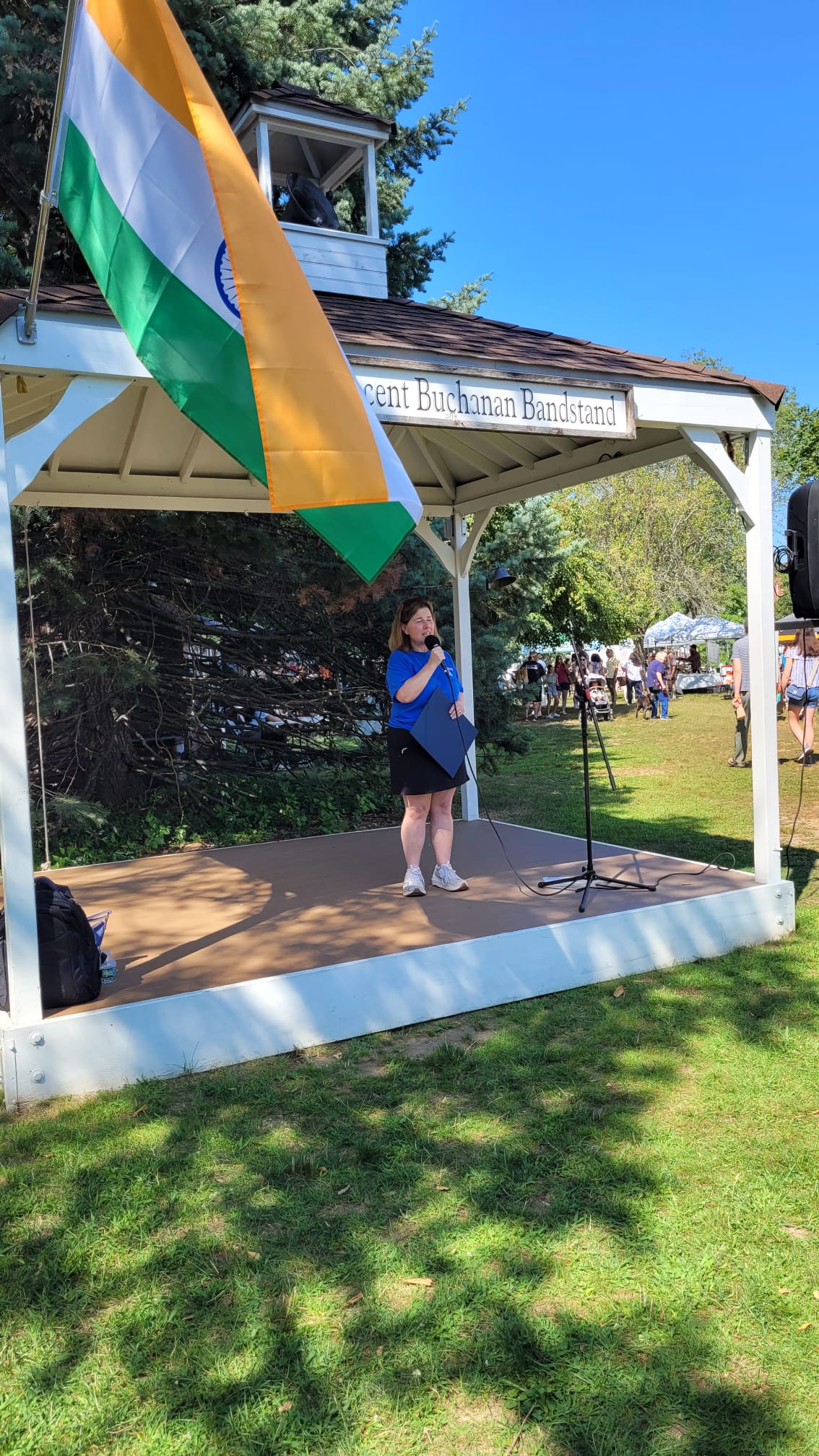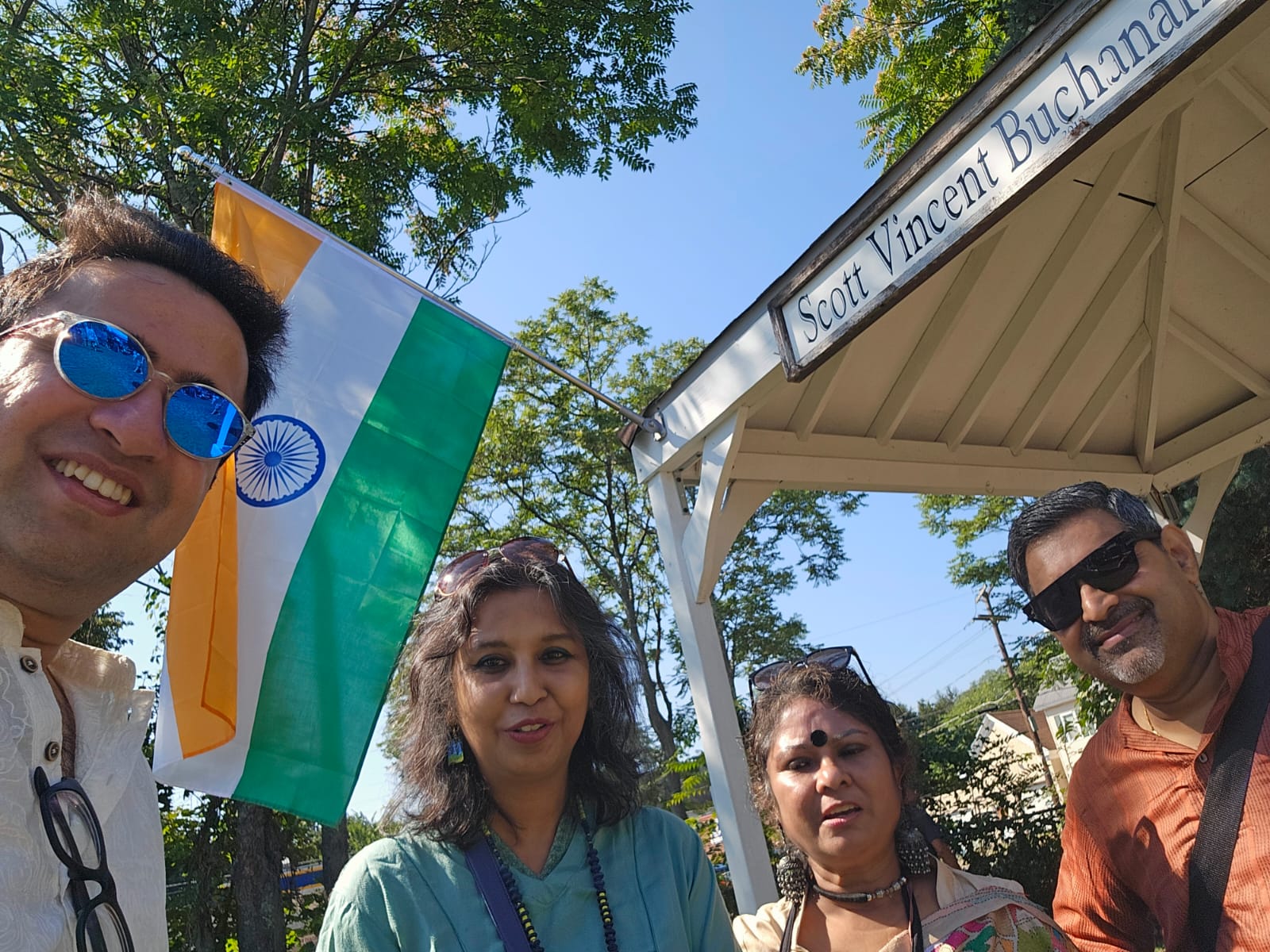 The Indian flag was raised at the bandstand. The tricolor flag has saffron, white and green bands. Saffron stands for strength, white for purity and the green for growth. A “chakra” or wheel is at the center of the white band and has twelve spokes. It was inspired by emperor Ashoka in the 3rd century BC and the spokes symbolize values such as justice, knowledge, love that guide the nation. Both anthems of India and US were played thereafter.
