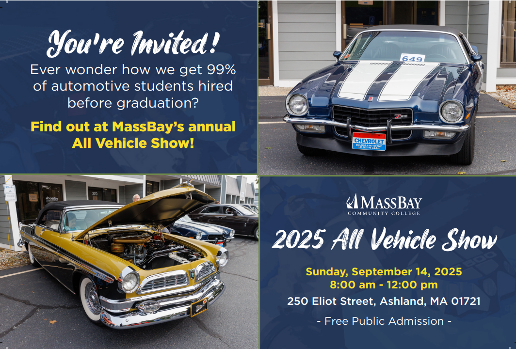 MassBay Community College will hold its annual All Vehicle Show on Sunday, September 14th from 8AM – 12PM at the MassBay Automotive Technology Center in Ashland, MA. The show is free and open to the public. It is $20 to register a vehicle, with all proceeds supporting MassBay Automotive Technology student scholarships. The All Vehicle Show will feature vehicles of all genres —from 1930s roadsters to modern muscle cars to imported vehicles. Spectators who attend can vote to award the Top People’s Choice Cars and Top Show Cars. In addition, any MassBay alumni who attends can vote for the Alumni Choice Awards.