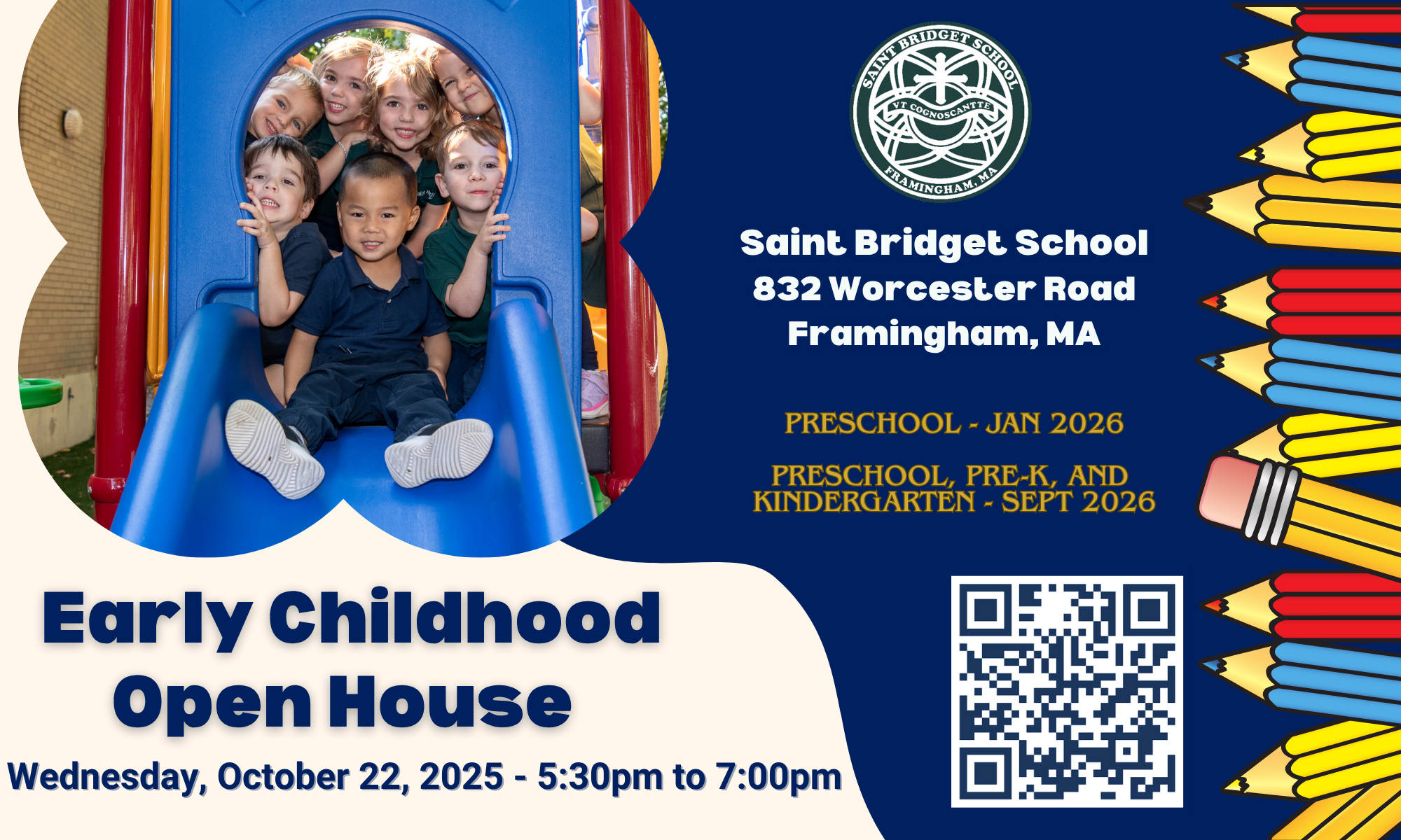 Saint Bridget School warmly invites you to our Early Childhood Open House on Wednesday, October 22nd from 5:30pm to 7:00pm! Come meet our dedicated faculty and staff, explore our nurturing classrooms, and learn how we combine strong academics with Catholic values to help our youngest learners grow in faith and knowledge. We can’t wait to meet your family!