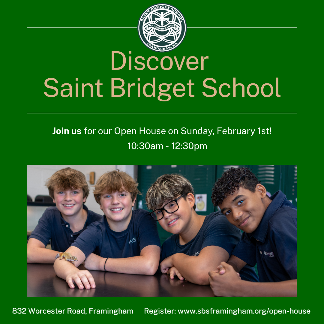 Saint Bridget School has rescheduled our school-wide Open House to this Sunday, February 1st from 10:30am to 12:30pm. Come join us, tour our school, and meet our Faculty and Staff. See you on Sunday!