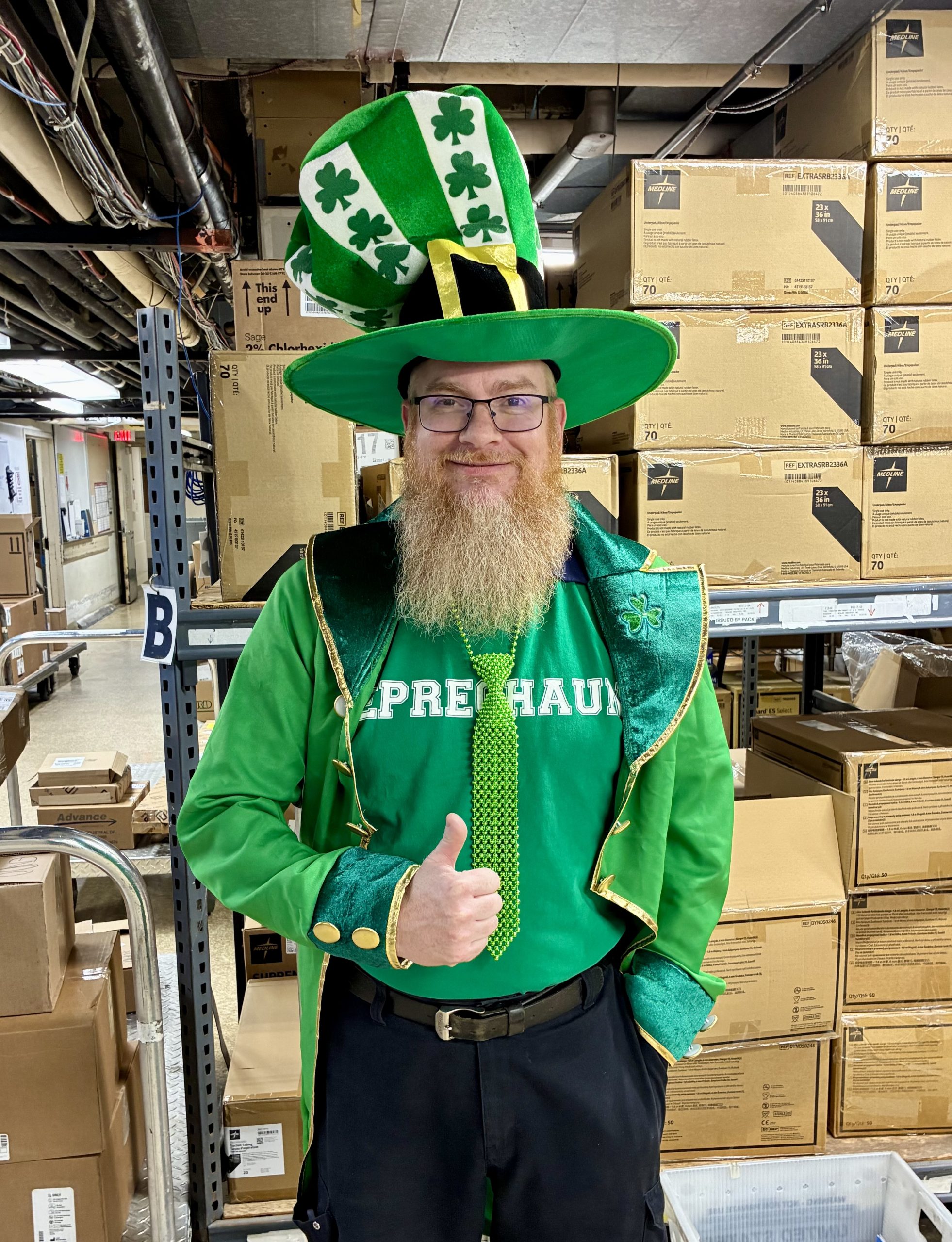 Even in shipping and receiving, where much of the hard work happens behind the scenes, Mike is committed to bringing smiles, lifting spirits, and spreading a little St. Patrick’s Day magic to everyone around him.